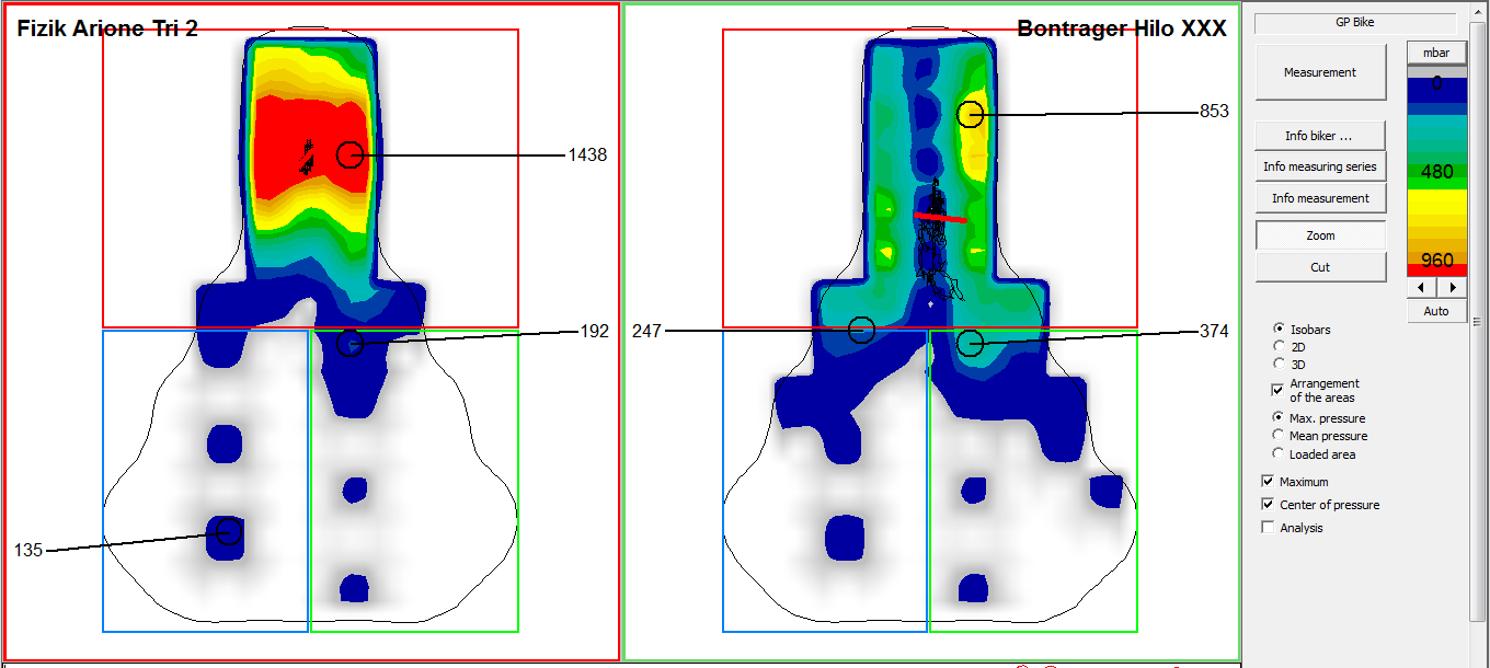 The first was we switched to a new saddle. Matt used pressure mapping to show that I was putting a lot of pressure on the nose of my previous saddle. I am now switching over to the Bontrager Hilo XXX and you can see from the before and after pictures below that the Hilo distributes my weight a lot more evenly.